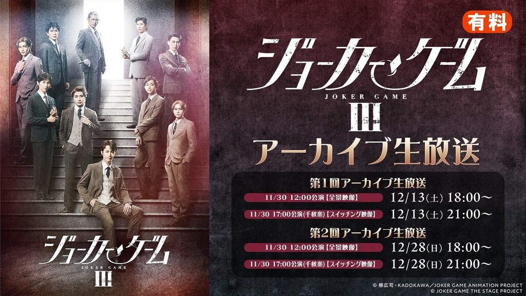 舞台『ジョーカー・ゲームⅢ』千秋楽2公演のアーカイブ生放送がニコニコ生放送にて12/13(土)、12/28(日)の2日間・全2回放送決定