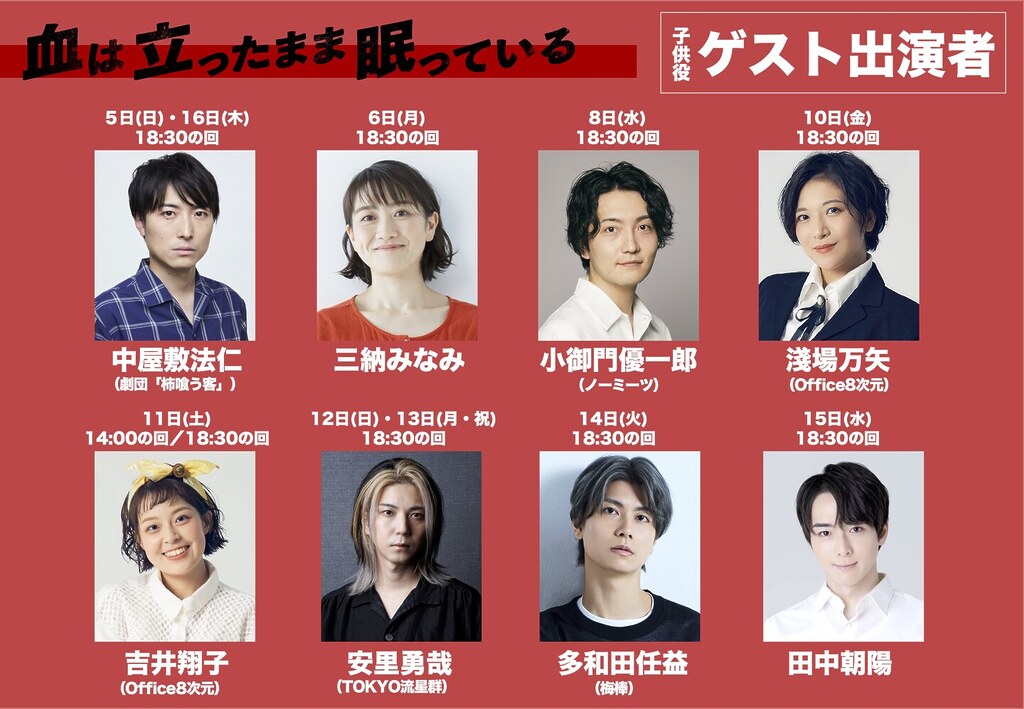 また、物語の重要なカギを握る「子供」役には赤坂芸術祭に場。出しろもボリュームがあり、初日には演出の中屋敷の「子供」役を怪演。各ゲストがどのように演じるのか楽しみだ。赤坂芸術祭2025「血は立ったまま眠っている」は10月16日(木)まで、赤坂サカス広場特設紫テントにて全11公演を上演する。